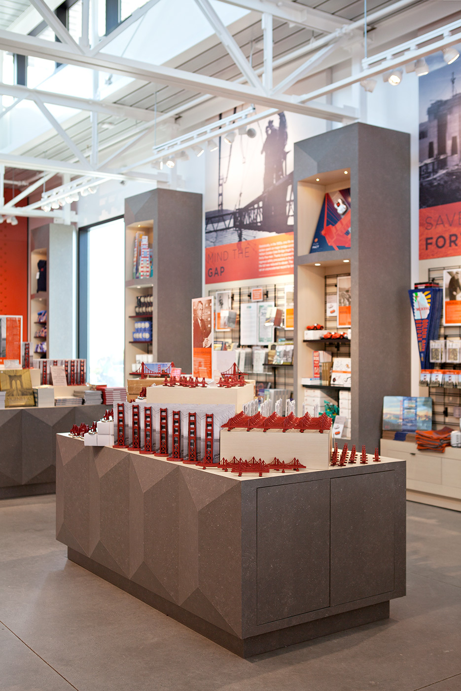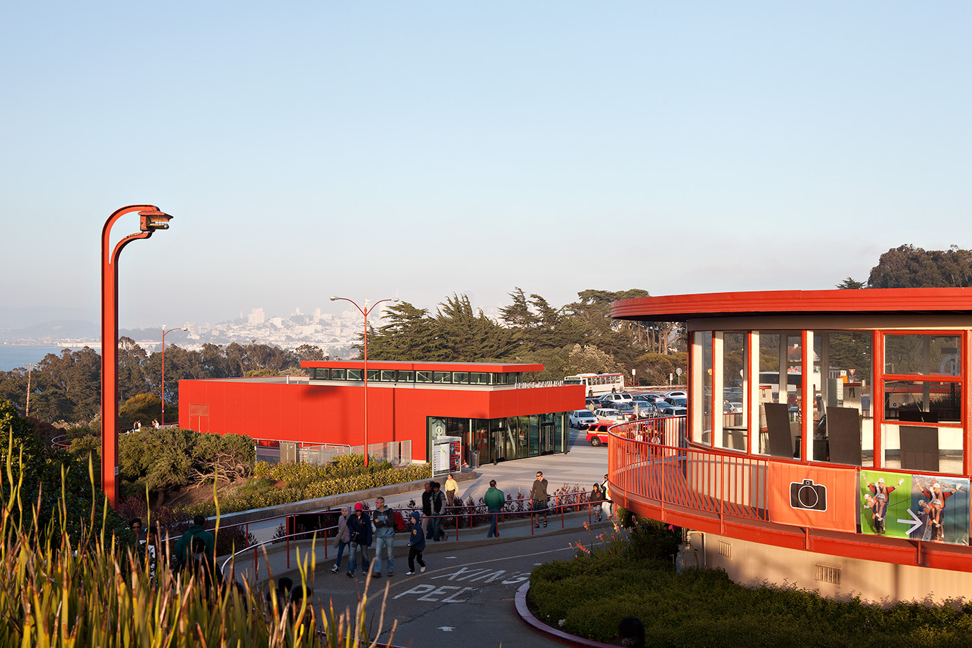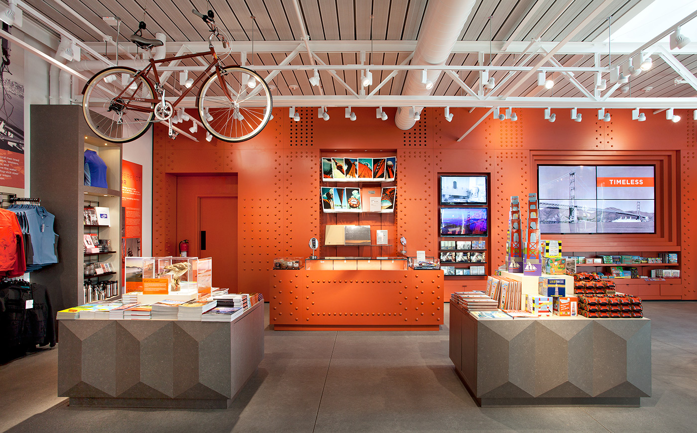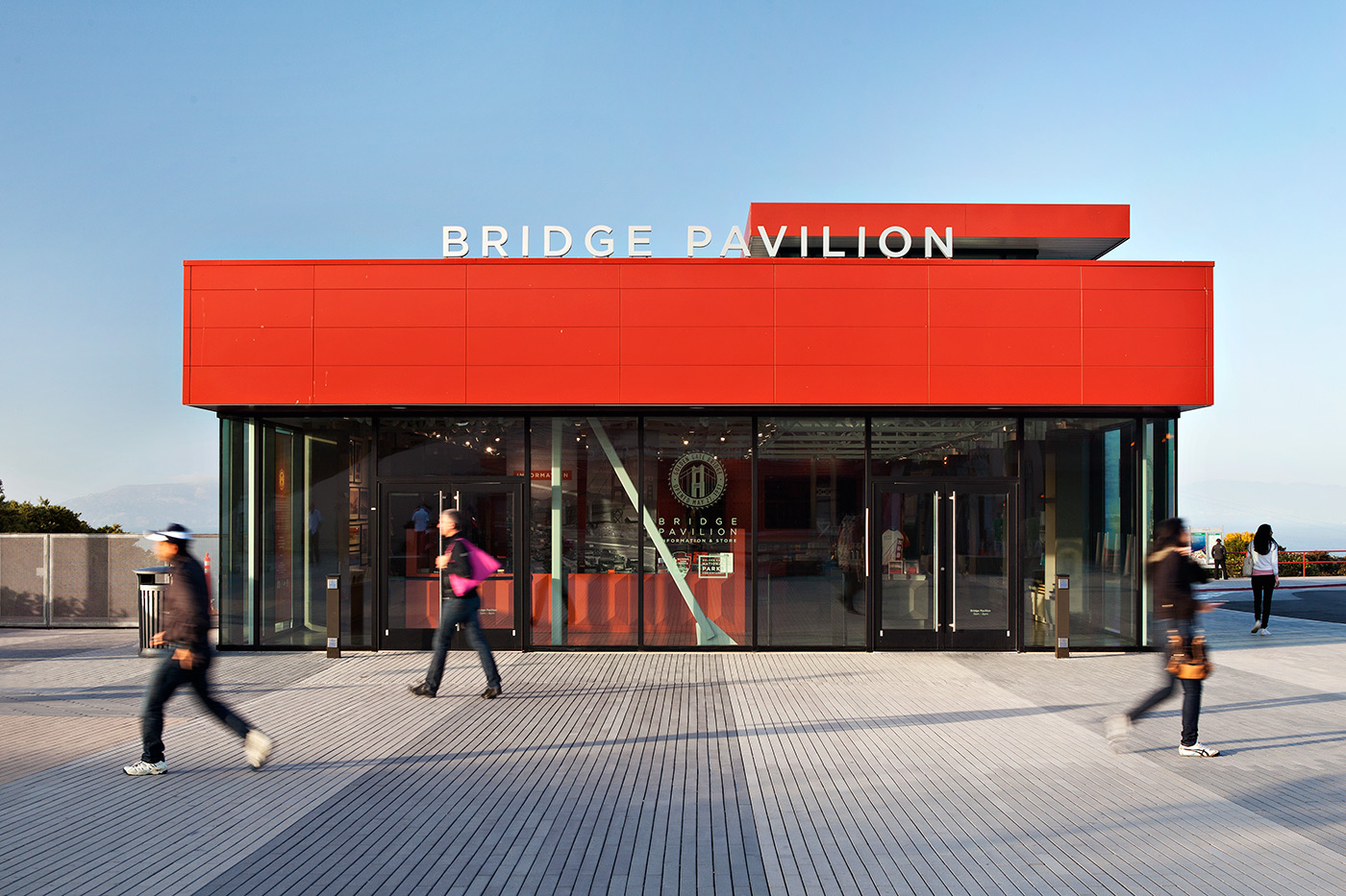 About/ In honor of the 75th Anniversary of the construction of the Golden Gate Bridge, a new Bridge Pavilion was built adjacent to the toll plaza. Designed in collaboration with Project Frog, the building is painted the famous International Orange color of the adjacent bridge and will serve as a vibrant hub for visitors. The program includes interpretative exhibits, an information center, and a retail store. The structure itself is an innovative pre-engineered green building kit comprised of standardized structural elements, wall panels, and glazing units. All components were fabricated off-site and quickly installed on-site in advance of the anniversary celebrations. The building carefully responds to the massing of other buildings on the historic site while standing on its own as a new civic amenity with its own strong identity.