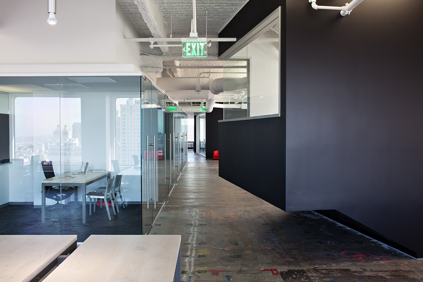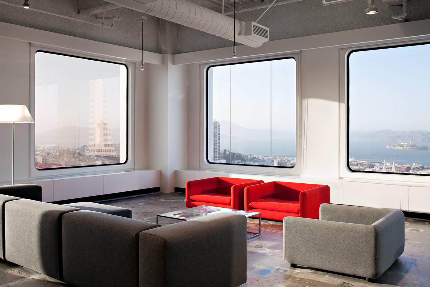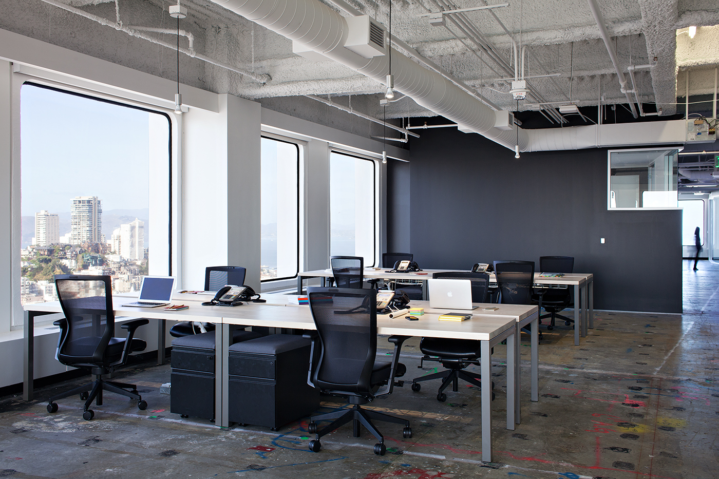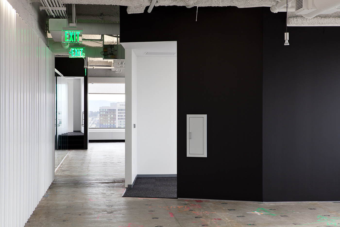 About/ In this project for advertising agency, Goodby, Silverstein & Partners, two floors of a downtown office tower are stripped back to their core elements exposing the structural slab, steel framing, and mechanical systems. The core wall is wrapped with an acoustic assembly comprised of insulation, fabric, and vertical wood boards of varying depths providing both a visually undulating surface and sound dampening for the space. A series of “social condensers” are dispersed around the perimeter creating smaller neighborhoods within the otherwise open floor plan. The social condensers provide unique environments in which the employees can engage each other and the city beyond. A block of private offices is wrapped in glass, providing the necessary acoustic privacy while maintaining the openness and transparency of the overall space. The contrasting black & white palette is both neutral and dynamic – the white surfaces reflect light while the black surfaces frame and capture it.