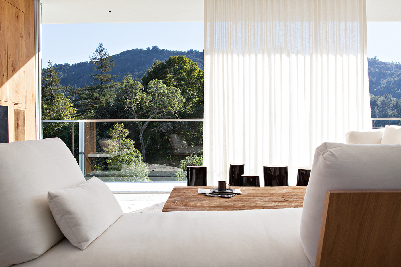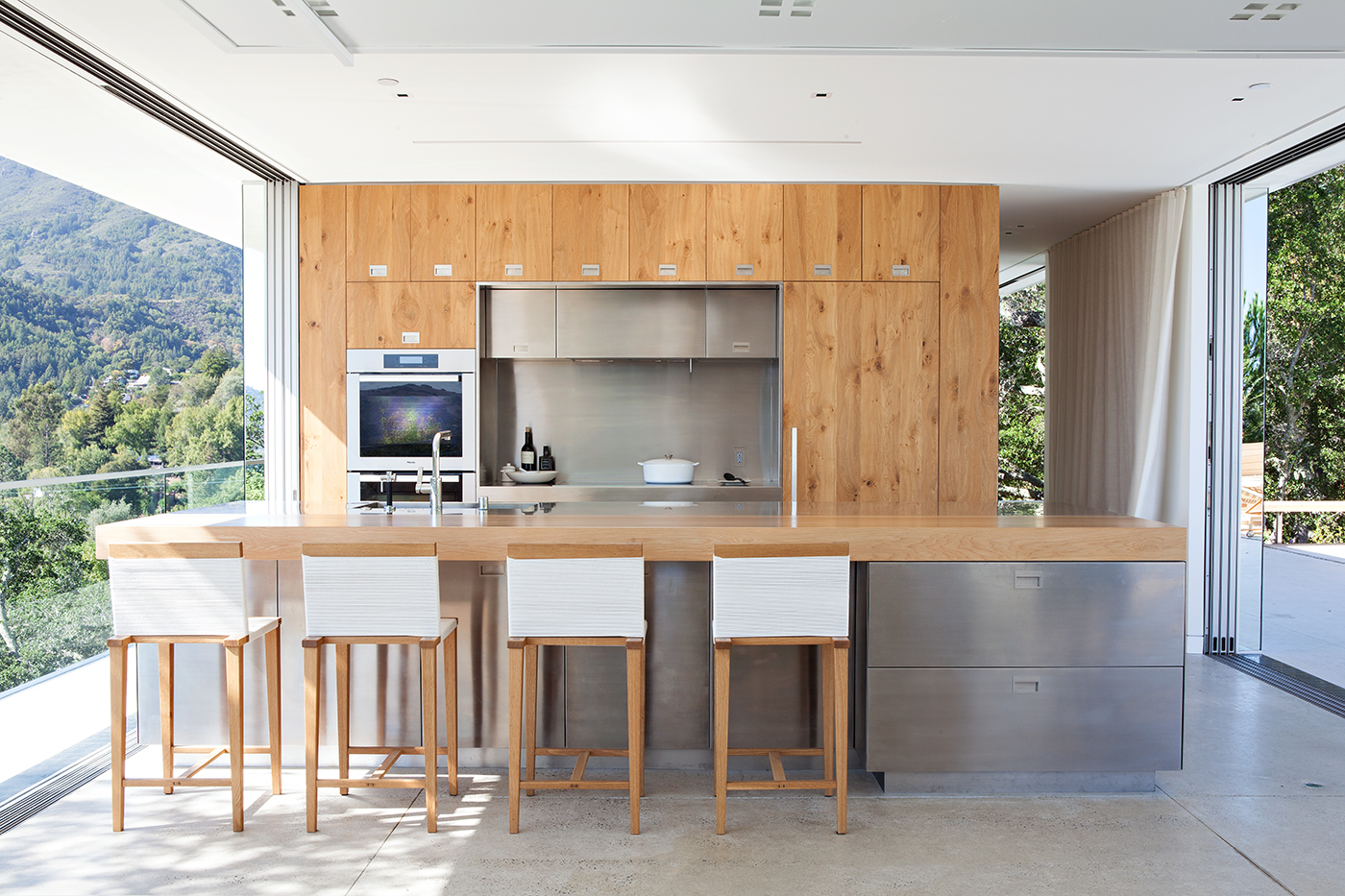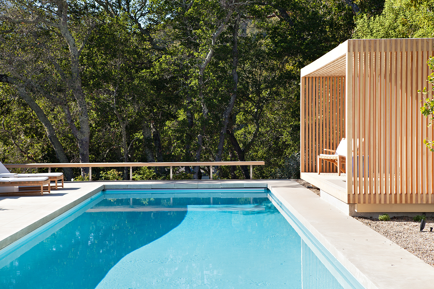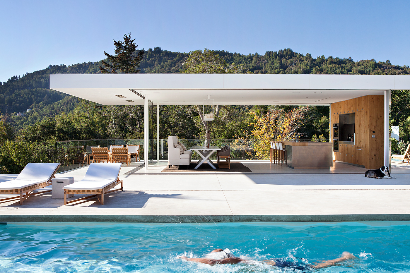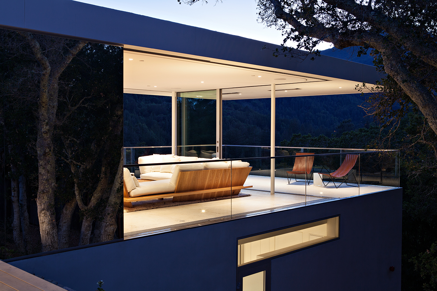 About/ A plinth and a pavilion. Nestled into the hillside, the long, solid plinth contains the private rooms of the house. Atop this plinth sits a transparent living and dining pavilion that opens up completely for access to the outdoor decks, pool patio and expansive views to Mount Tamalpais and the bay. An elegant structural solution allows the views to be uninterrupted by perimeter sheer walls. The majority of the site is left undeveloped with its forest of native oaks intact.