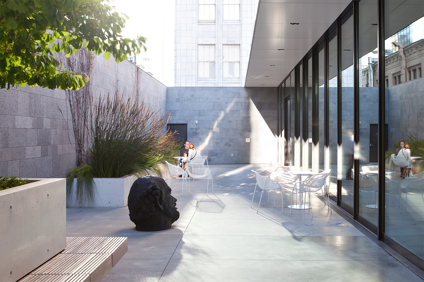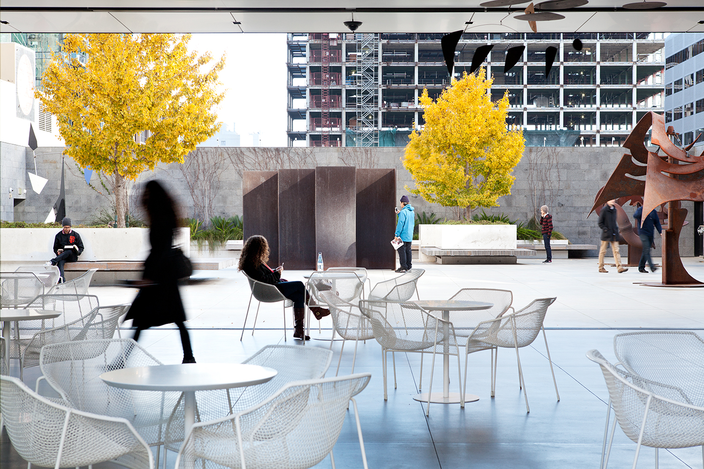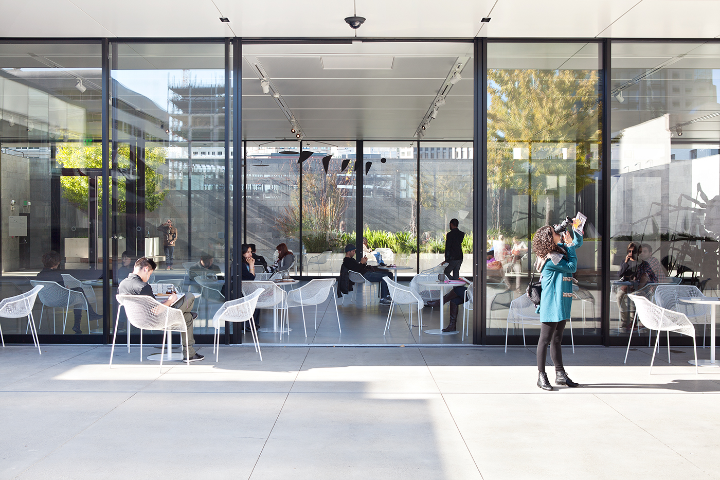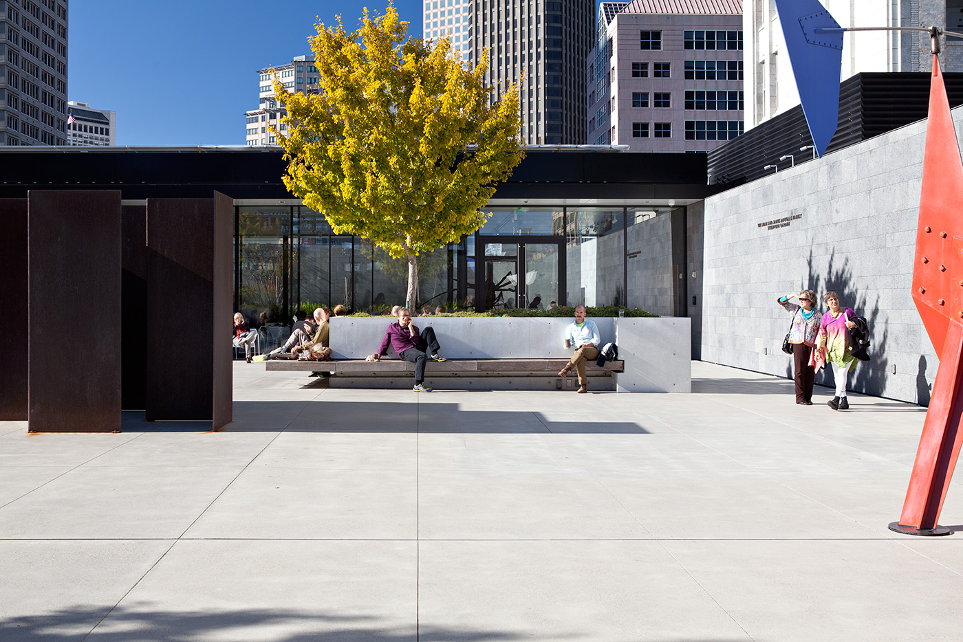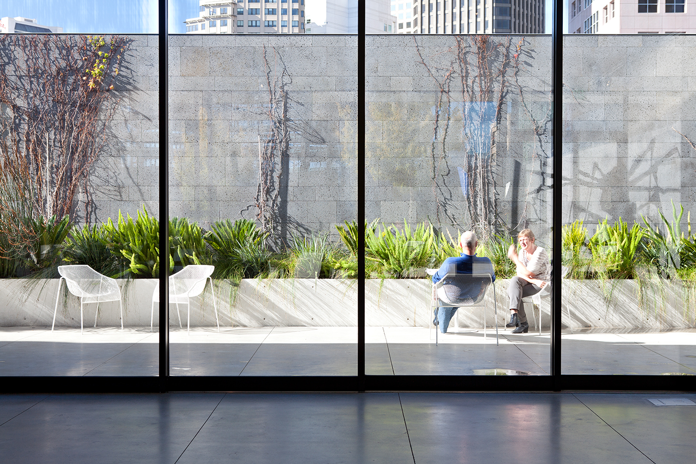 About/ The SFMOMA’s rooftop garden is an open-air gallery defined by the intersection of sculpture, space and light. The entire back wall of the museum’s top floor is removed, allowing a seamless connection from gallery to garden. A large panoramic window at this new opening offers an elevated view to the garden, presenting it like a landscape painting inside the gallery. A glazed long-span bridge links the Museum to a garden pavilion that in turn opens out to the garden through large sliding glass panels. Surrounding the garden, lichen-covered lava-stone walls hide the city and frame the sky, providing an oasis for art in the midst of downtown San Francisco.