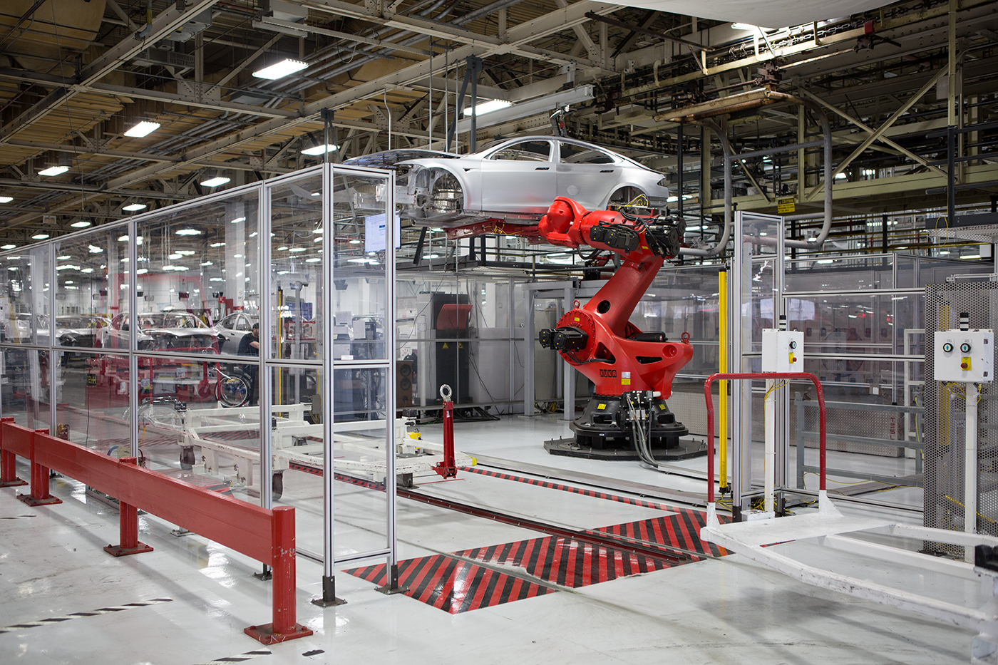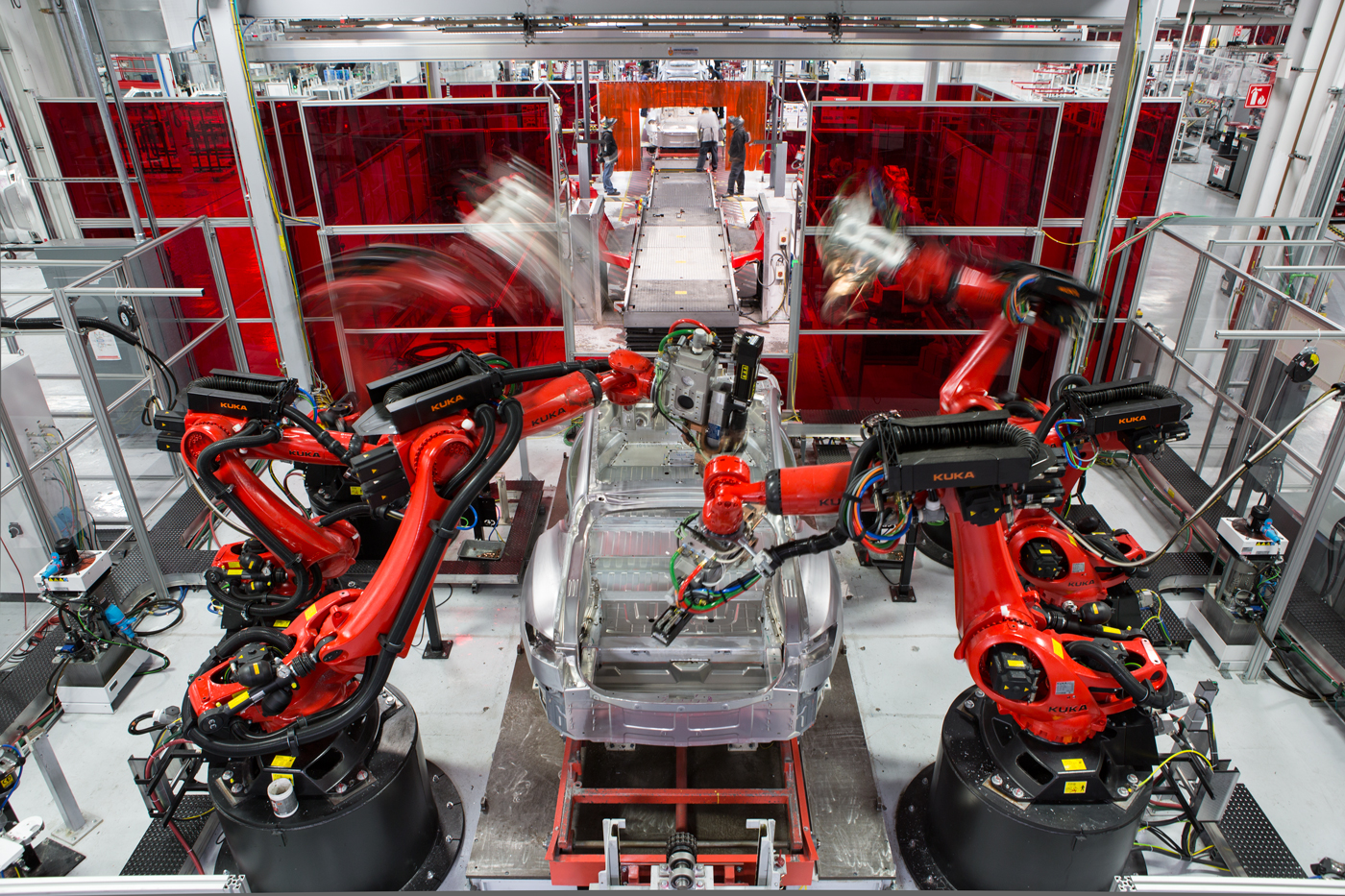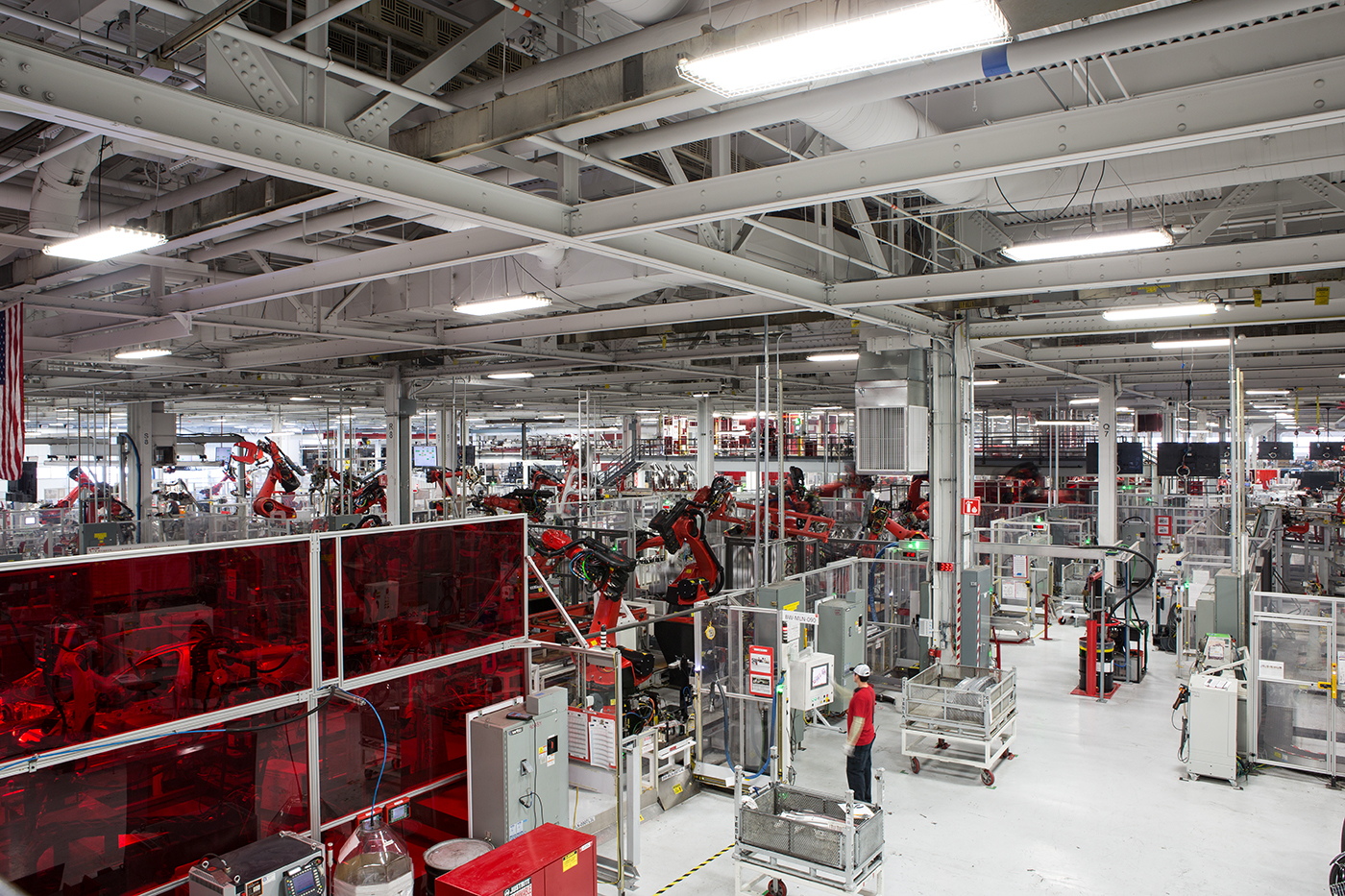 Tesla purchased the facility in 2010 and extensively remodeled it before the first Model S rolled off the line in June 2012. They added skylights and high-efficiency overhead lights to brighten what was once a dark, enclosed space. Floors and walls are painted a pristine white to both brighten up the space and set the tone for laboratory like attention to detail. State of the art robots now help lift, turn, weld and assemble the aluminum occupant cell and body to extremely high tolerances.